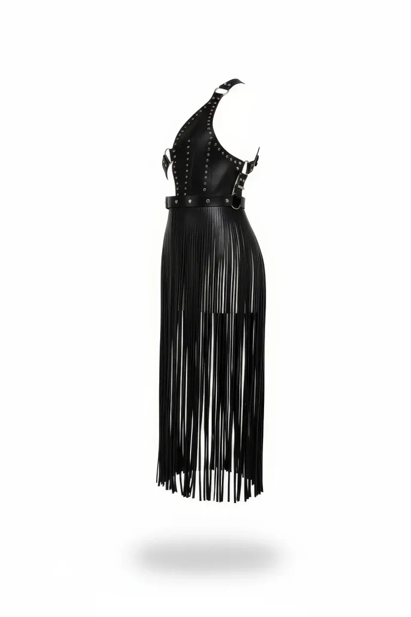 Crafted from premium quality faux leather, this exceptional studded harness dress features intricate metalwork and adjustable straps for a perfect, comfortable fit. The dramatic, floor-sweeping fringe skirt ensures mesmerizing movement with every step, making it the best faux leather fringe dress for dynamic events. Available in sizes S-XL, secure this essential piece of clubwear or festival outfit now and redefine your bold aesthetic before it's gone.
