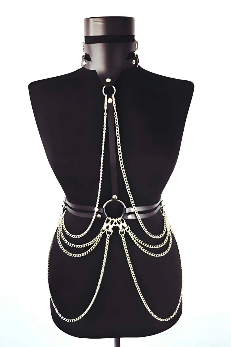 Looking for a stunning chained body harness that commands attention? Our exquisite faux leather and chain body harness immediately elevates your style, offering a bold statement piece designed for ultimate impact. Experience unmatched allure and confident expression with this must-have accessory, perfect for making an unforgettable impression.