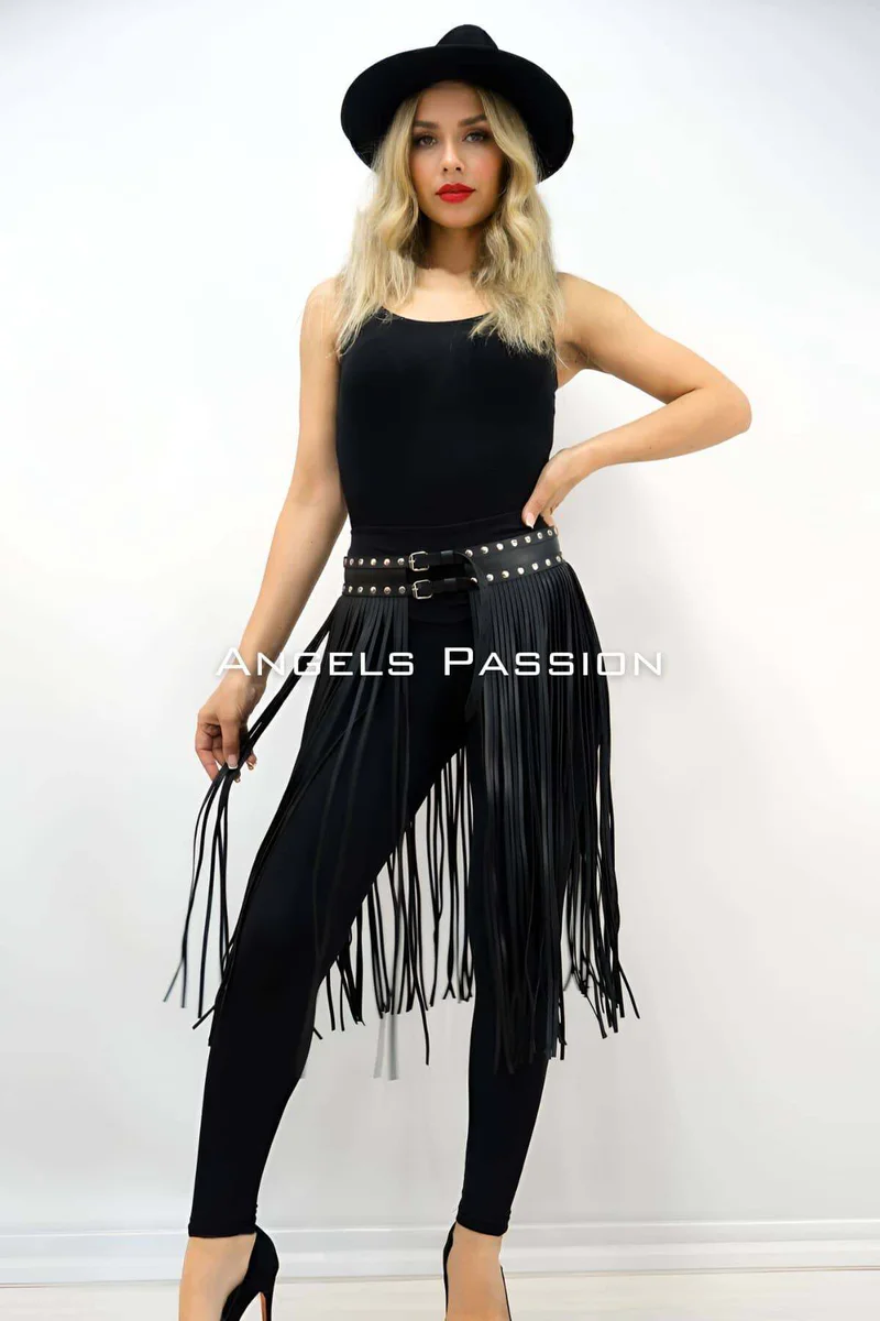 Looking for a chic fringe belt skirt? Discover our stunning black faux leather fringe belt skirt, designed to instantly elevate any outfit with its bold, captivating movement. This versatile waist accessory promises to transform your look, adding a dynamic, fashionable edge that turns heads wherever you go, ensuring you stand out effortlessly.