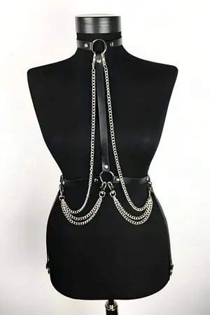 Leather Choker Necklace with Draped Chains and Rings