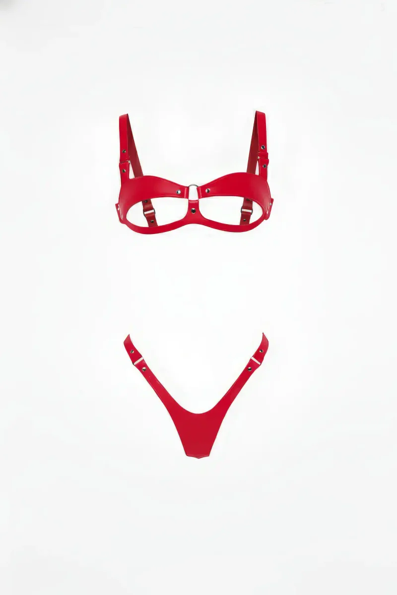 Red Harness Set Shiny Leather Open Cup Bra Thong Set - APFT1382