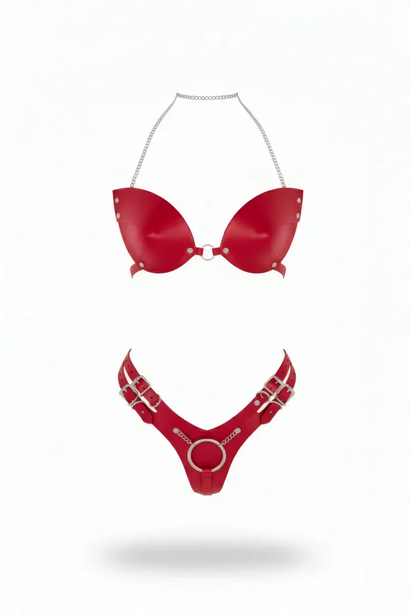 Red Harness Suit with Shiny Leather Chain Neck Detail - APFT1223
