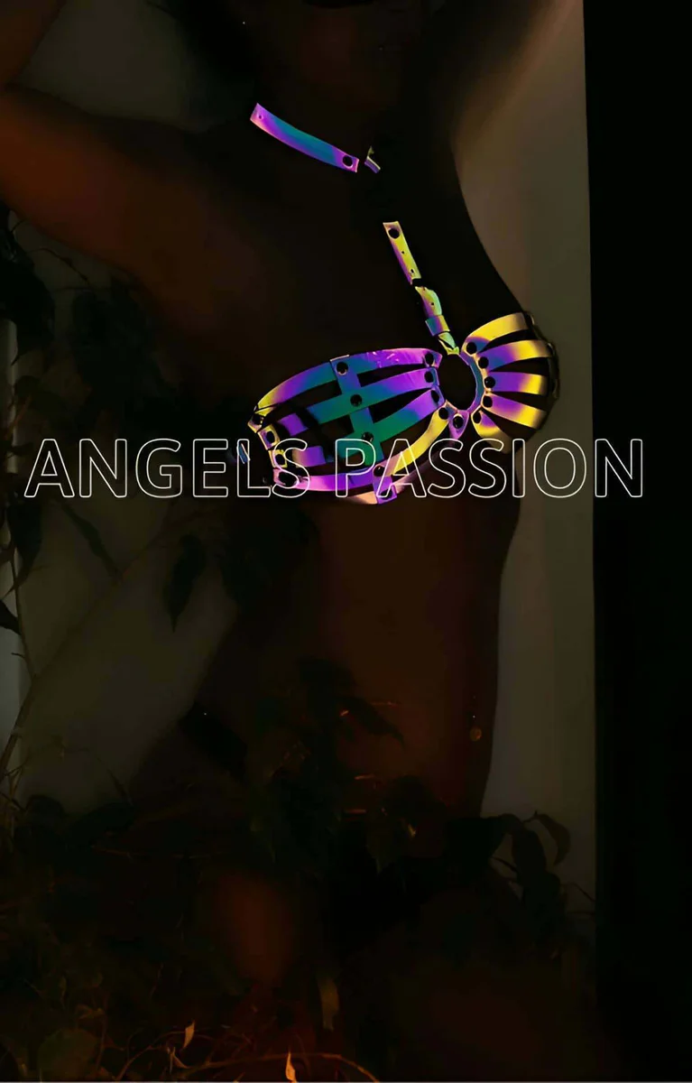 Crafted from premium, durable reflective material, this iridescent harness bra ensures both comfort and spectacular visual effects. Its adjustable straps and thoughtful design provide a secure, flattering fit for various body types, making it a versatile addition to your wardrobe. Perfect for pairing with high-waisted bottoms, skirts, or layering under sheer tops. Don't miss out on owning this exclusive piece – elevate your festival gear or night-out ensemble. Discover your ultimate glow and make it yours today before it sells out!
