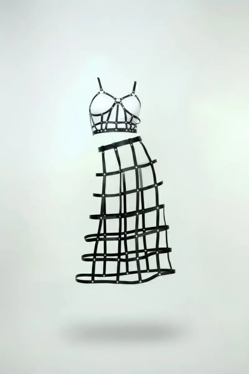 Imagine owning the night, feeling empowered and unforgettable in every glance. This striking cage top and skirt set isn't just clothing; it's an attitude. Designed to highlight your form with its intricate straps, it allows you to express your boldest self, elevating any occasion from a rave to a night out. Feel the unparalleled thrill of being the center of attention, exuding a fierce, dominant aesthetic.