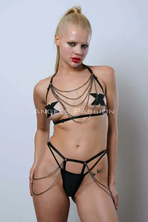 Black Harness Suit Chain Detailed Leather Body Accessory - APFT497